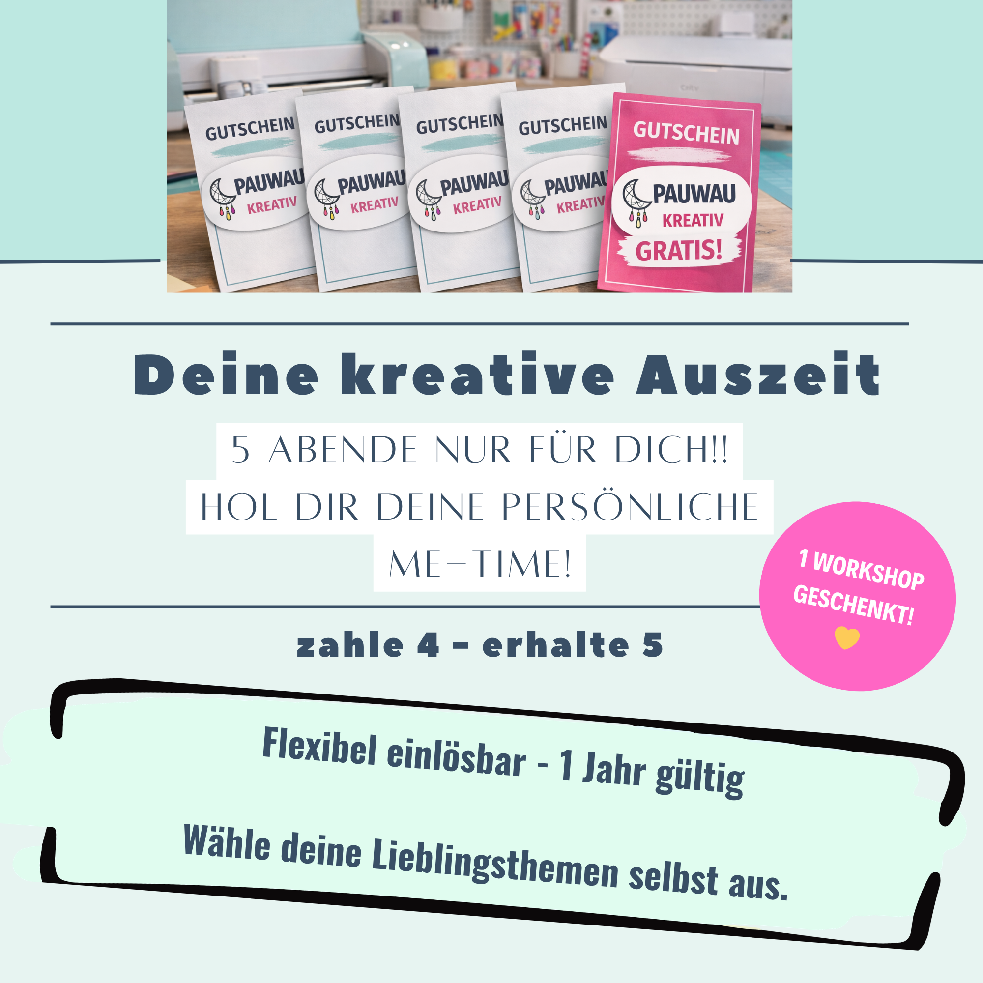 Mit diesem Bundle sicherst du dir fünf Pauwau kreativ Workshop-Abende, die du ganz flexibel nach deinen eigenen Wünschen auswählen kannst.