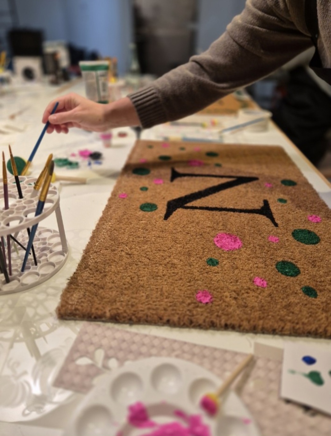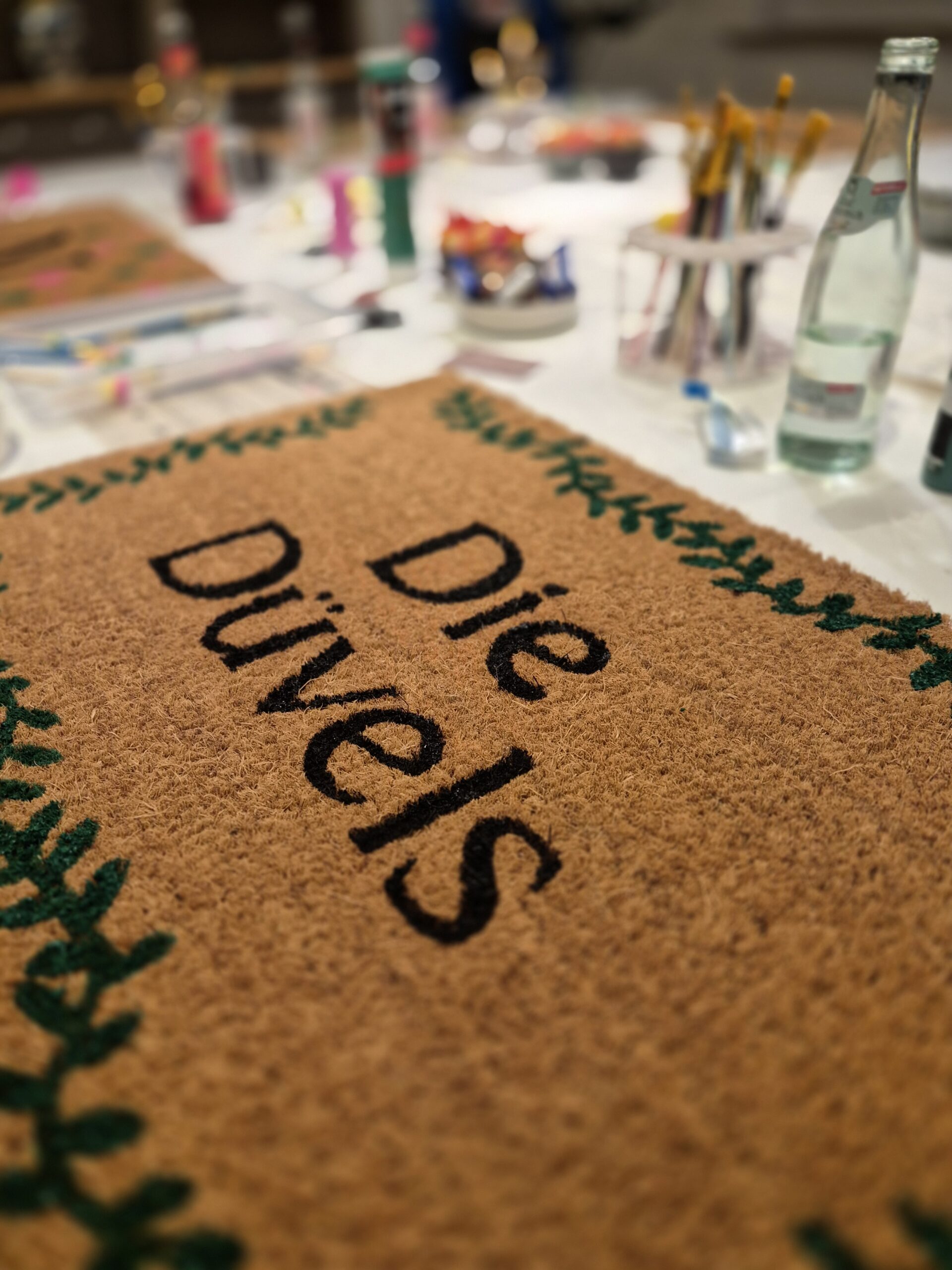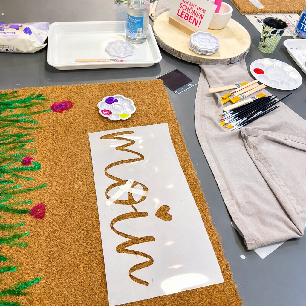 In entspannter Atmosphäre zeigt dir Mone Schritt für Schritt, wie deine personalisierte Fußmatte entsteht – vom Design bis zum letzten Pinselstrich.
