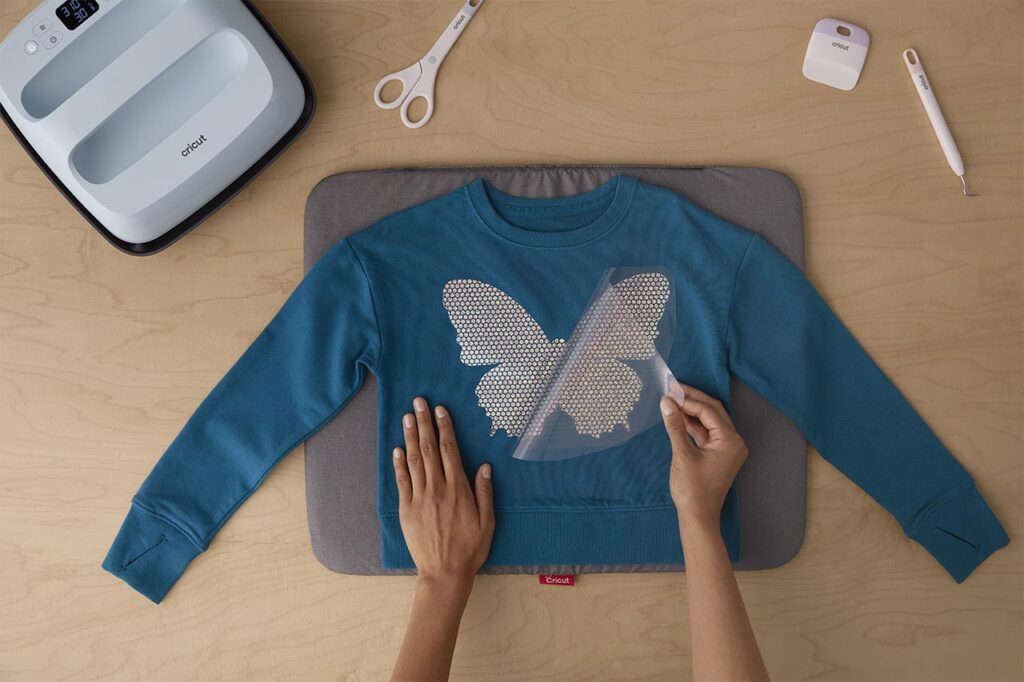 - Trägerfolie abziehen (bei Cricut-Folien immer “handwarm”, nicht heiß!)